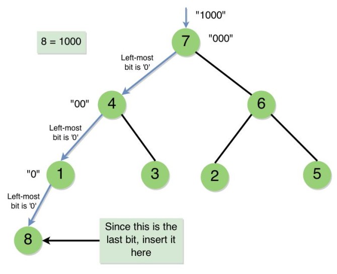 • The Binary String left is “0”. There is only one bit left. This bit doesn’t tell you to “go left” or “go right”, it tells you to “insert it to left” or “insert it to right”. As this bit is “0”, we place the new node as the left child of Node 1.